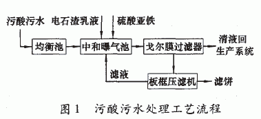 污酸污水處理工藝流程如圖1。來自冶煉系統(tǒng)和制酸系統(tǒng)的污酸污水引人均衡池混合;混合后,污酸污水由泵輸送到中和曝氣池,達到一定液位后,向中和曝氣池內(nèi)投加、[Ca (O H ),」為20%左右的電石渣乳液,調(diào)整pH值為7.8一8.0,使污酸污水中的氟離子、重金屬離子和部分砷沉淀,再根據(jù)污酸污水中砷化物含量投加適量FeS04,同時向混合液中通人壓力為50 kPa左右的空氣進行攪拌并起氧化作用,保證反應充分并促進Fe(OH)2氧化成絮凝效果好的Fe(OH)3膠體,將廢水中的亞砷酸及亞砷酸鹽沉淀;曝氣反應完全后,根據(jù)污酸污水中重金屬離子含量的高低,決定是否微調(diào)pH值至8.5一9.0 ; 中和曝氣反應后的污酸污水通過戈爾膜過濾器進行固液分離,上部清液達標返回生產(chǎn)系統(tǒng)循環(huán)利用,底流經(jīng)板框壓濾機壓濾,濾渣無害化堆存,濾液返回中和曝氣池。