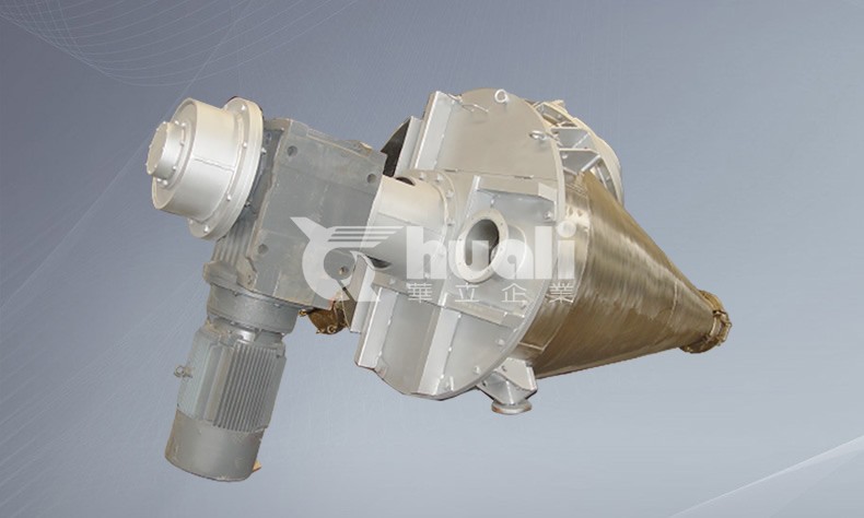 本機主要由錐形筒體、螺旋軸、傳動機構(gòu)及出料部件等組成。物料由上部加入,電機帶動特制擺線針輪減速機,使螺旋軸系統(tǒng)作公轉(zhuǎn)和自轉(zhuǎn),大螺旋軸緊靠筒壁小螺旋軸靠近中心,兩螺旋軸同時作行星運動。將物料自下而上提升,形成沿錐形筒壁上升的物料流。同時轉(zhuǎn)臂帶動螺旋軸公轉(zhuǎn),使螺旋體外的物料混入螺旋體內(nèi),整個錐形筒體內(nèi)物料不斷錯位提升、相互摻混。由錐形筒體中心匯合向下流動。由于該機的三重混合作用,使物料能在較短時間內(nèi)達到混合均勻。