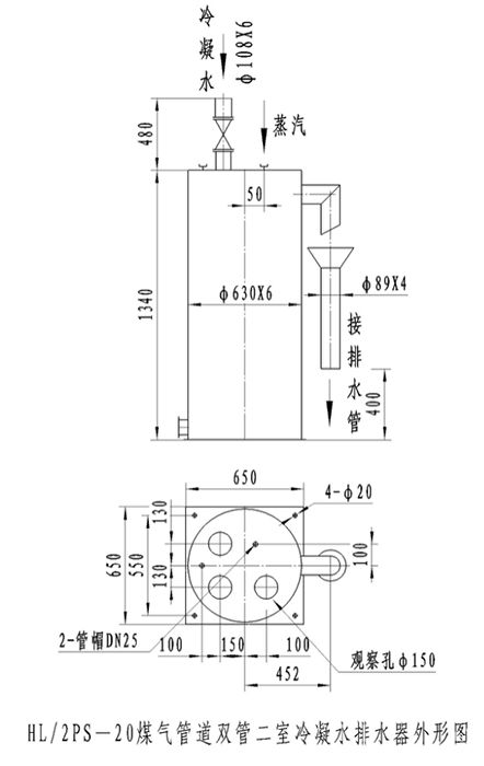 3、插入敝開室的DNl″蒸汽管,視南北地區(qū)的氣候條件決定是否需要接上外部蒸汽管,南方地區(qū)不接蒸汽管時需用管帽蓋上。