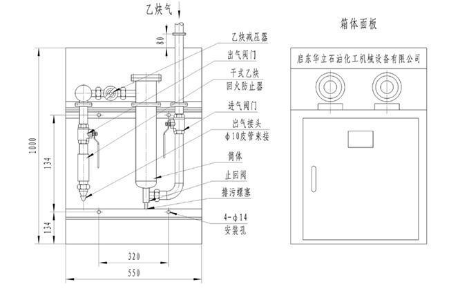 乙炔氣點(diǎn)閥箱主要由進(jìn)氣控制閥門、止回閥、貯氣裝置(內(nèi)裝適量阻火填料)、乙炔減壓器、分流控制裝置、干式乙炔回火防止器、出氣接頭(束裝)和箱體組成。箱體背面有4個(gè)φ14的安裝孔,可供掛壁安裝。箱體正面板上安裝有進(jìn)氣壓力表和出氣壓力表,可同時(shí)供一把或多把切割槍使用乙炔氣,調(diào)壓方便,壓力穩(wěn)定,安全可靠,是乙炔氣用氣點(diǎn)的理想設(shè)備。