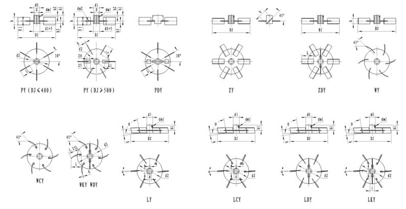 注:該系列攪拌器選型時,一般先決定葉片形狀,然后考慮安裝維護(hù)方便,確定結(jié)構(gòu)型式,通常DJ≤500采用整體式,500≤DJ≤700采用槳葉可拆式,DJ≥800采用輪殼對開式。