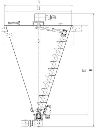 本機(jī)主要由錐型筒體、螺旋軸、公轉(zhuǎn)傳動(dòng)臂、自轉(zhuǎn)轉(zhuǎn)動(dòng)頭及出料閥組成。物料由上部加入。上部減速機(jī)帶動(dòng)公轉(zhuǎn)傳動(dòng)臂使螺旋軸在筒體內(nèi)作公轉(zhuǎn)運(yùn)動(dòng)。下部減速機(jī)帶動(dòng)螺旋軸作自轉(zhuǎn)運(yùn)動(dòng),由于兩軸相交成一定角度,中間使用特制的萬(wàn)向聯(lián)軸節(jié)傳動(dòng)。