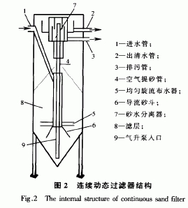“連續(xù)過濾”(continuous sand filter)是近年來國外研制成功的一種新型過濾技術(shù),在此基礎(chǔ)上,各國公司分別開發(fā)了新型的一體化水處理過濾設(shè)備。挪威Nordic Water公司的Dynasand,在過濾器中完成混合、混凝、過濾和反沖洗,連續(xù)過濾、連續(xù)反沖洗,無需反沖洗泵和反沖洗水箱,是一種高效節(jié)能的水處理設(shè)備。