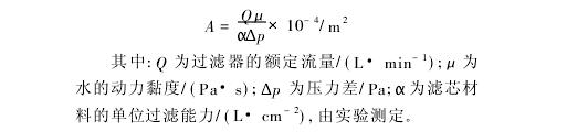 過濾器的工作能力取決于濾芯的有效過濾面積、濾芯本身的性能、水的粘度、過濾器壓差及水中固體顆粒的含量。過濾器進出口壓差越大,阻力越小時,過濾器的過濾能力越大。水流通過濾芯的速度越低,表面壓力越小,則過濾精度越高。過濾器的設(shè)計主要根據(jù)工作壓力和過濾精度的要求選擇濾芯材料,按所要求的流量及選擇的濾芯材料來計算過濾面積。過濾器的有效過濾面積[4]